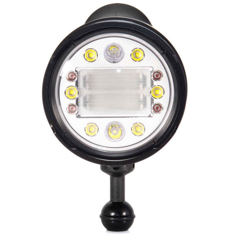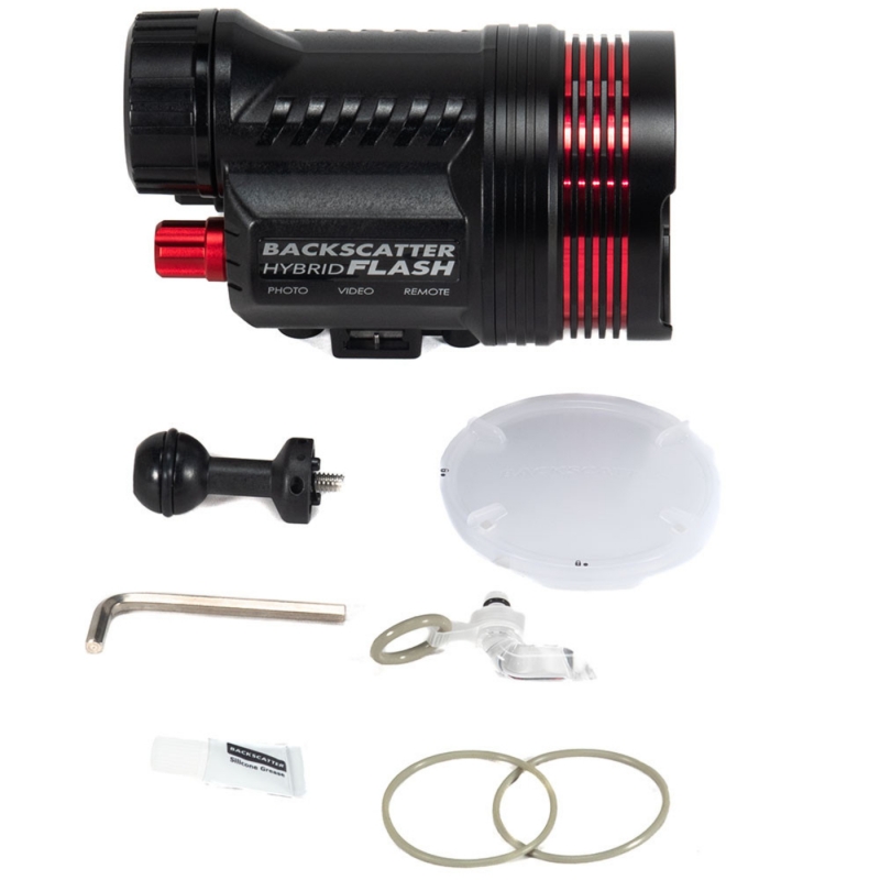 Der Backscatter Hybrid Flash HF-1 vereint einen leistungsstarken Unterwasserblitz (GN 40) mit einem 5000 Lumen Videolicht in einem einzigen, kompakten System.