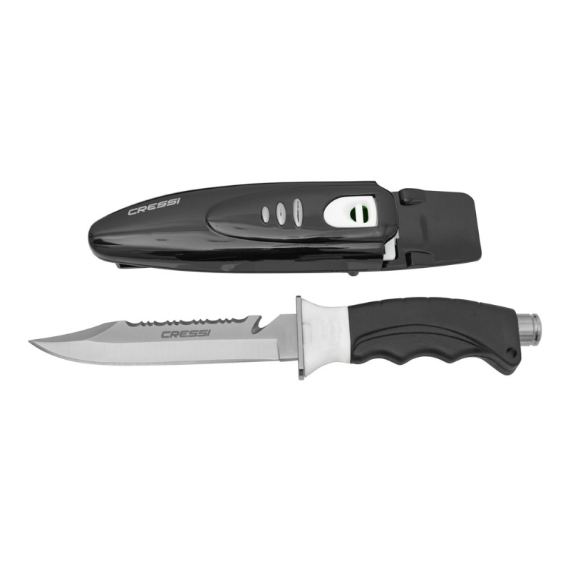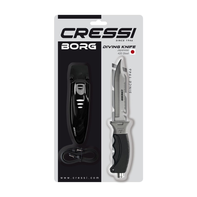 Borg ist ein modernes, mittelgroßes Messer mit einem Design der neuesten Generation. Die robuste und widerstandsfähige Klinge besteht aus gehärtetem Edelstahl AISI 304. Der anatomisch geformte Griff ist mit "Soft-Grip" versehen und wird durch einen integrierten Handschutz aus Technopolymer von der Klinge getrennt. Am Ende des Griffs ist ein Hammereinsatz aus dem gleichen Material wie die Klinge integriert. Die Klinge selbst ist auf der einen Seite glatt geschliffen und auf der anderen Seite gezahnt. Auf der gezahnten Seite befindet sich in der Nähe des Griffes ein Leinenschneider zum Durchtrennen von Netzen und Angelschnüren. Die Scheide besteht aus schwarzem Technopolymer und ist mit Schlaufen zur Befestigung am Unterschenkel oder am Gürtel versehen. Die Arretierung des Messers in der Scheide erfolgt durch einen in die Scheide integrierten Druckknopf, der mit einer Hand schnell und präzise ausgelöst werden kann. Das Messer wird mit zwei Gummibändern zur Befestigung am Unterschenkel geliefert.