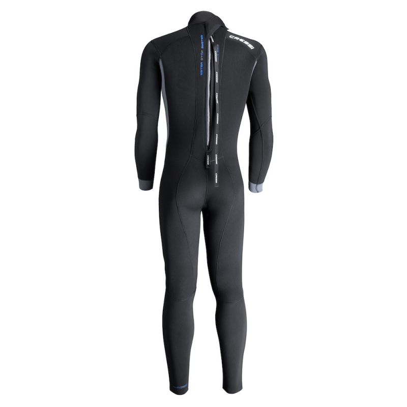 Einteiliger Kaltwasser-Nasstauchanzug aus 7-mm-Neopren, mit einer Außenschicht aus Elastic-Span und einem Innenfutter aus Elastic-Plush. Diese Materialien machen den Anzug warm und extrem elastisch, so dass er sehr einfach anzuziehen ist. Ein YKK-Reißverschluss (für optimale Qualität) verläuft vertikal über den Rücken. Die Knie sind mit speziellen Schutzaufnähern verstärkt. Am rechten Bein befindet sich eine sehr praktische Tasche mit zwei Fächern und einem nützlichen D-Ring. Doppelmanschetten an Hand- und Fußgelenken. Ein spezielles Dichtungssystem am Kragen minimiert das Eindringen von Wasser.