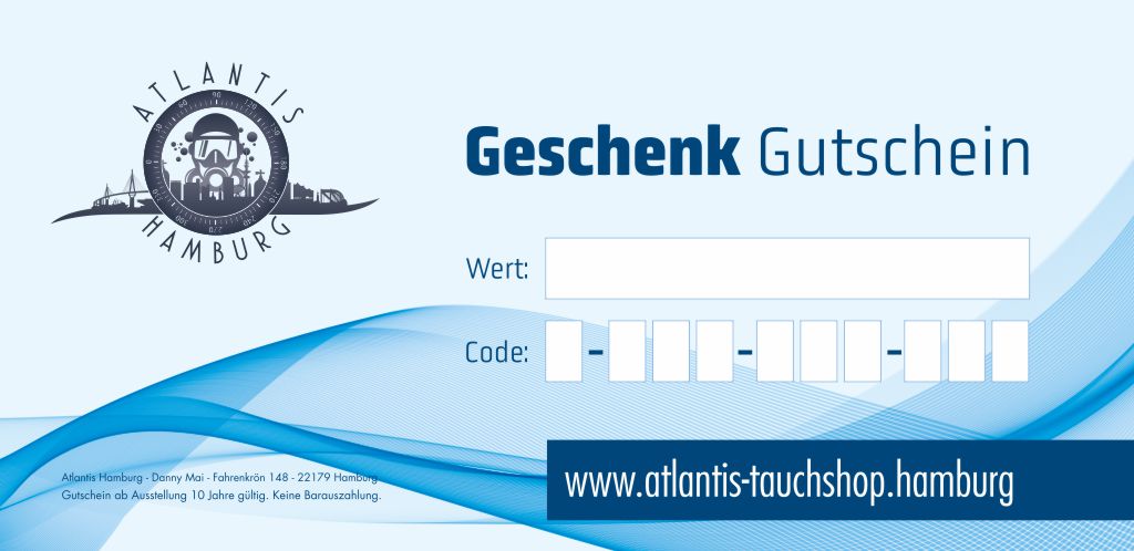 Das ideale Geschenk für alle Taucherinnen und Taucher. Der Gutschein kann im Onlineshop und bei Atlantis Hamburg eingelöst werden.