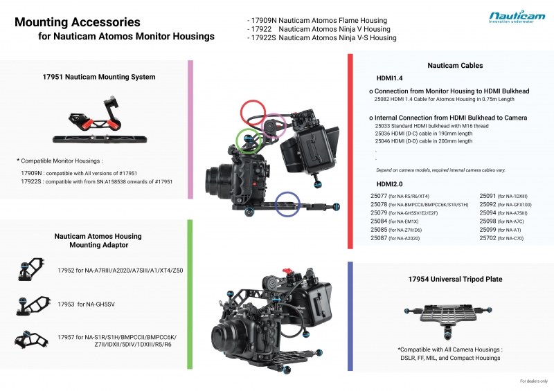 In Verbindung mit dem passenden Montageadapter ermöglicht dieses System die sichere und stabile Befestigung von kompatiblen Nauticam Monitor-/Recordergehäusen am Kameragehäuse,