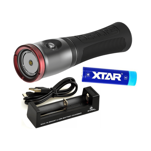Die Sea Dragon 1000F Lampe leuchtet bis zu 4,35 Stunden mit dem im Lieferumfang enthaltenen 2600mAh Li-Ionen 18650 Akku bei 25% Leuchtkraft. 2,2 Stunden beträgt die Leuchtdauer bei halber und 65 Minuten bei voller Leuchtkraft. Mit einem optional erhältlichen 3500mAh 18650 Li-Ionen Akku erhöht sich die Leuchtdauer auf 6 Stunden im 25%-Modus, 3 Stunden bei halber und 90 Minuten bei voller Leuchtkraft. Das Batteriefach verfügt über ein integriertes Sicherheitsüberdruckventil, welches eventuell entstehende Batteriegase bei einer Fehlfunktion zuverlässig nach außen leitet. Zwei nicht wieder aufladbare CR123 Batterien können zudem mit einer Laufzeit von 4 Stunden bei 25% Leuchtkraft und 60 Minuten bei voller Leistung genutzt werden. Die Lampe wird mit einem wieder aufladbaren 2600mAh Li-Ionen 18650 Akku sowie einem USB-Ladegerät geliefert..